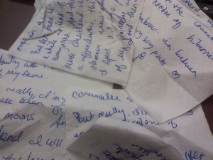 Last night I was out at one of said late night establishments waiting for Dave to finish playing his set so I could go home and pass out and began to write my blog on bar napkins. The bartender made a comment about J.K. Rowling, author of Harry Potter craziness, and how she started out homeless writing her story on cocktail napkins as well. And now, well, she’s richer than the Queen of England.