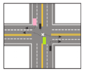 That’s her in pink in the Birdo cart.  That’s me in green in the Yoshi cart.  This is the way it was supposed to go.  Patty and Jackie want to go west on this lovely roadway, they both have a green light, and so to avoid collision while keeping traffic moving and getting everyone where they need to go, people turn into the same lane in the position as the one they are leaving.  I’m in the left lane.  When I turn, I stay in the left lane.  Patty is in the right lane.  When she turns, she is supposed to remain in the right lane.