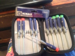After nearly stripping the second screw to little bits and bending the “Flat Head” eyeglass screwdriver into “Corkscrew Head” I was unconvinced, and a trip to Lowe’s was in order.