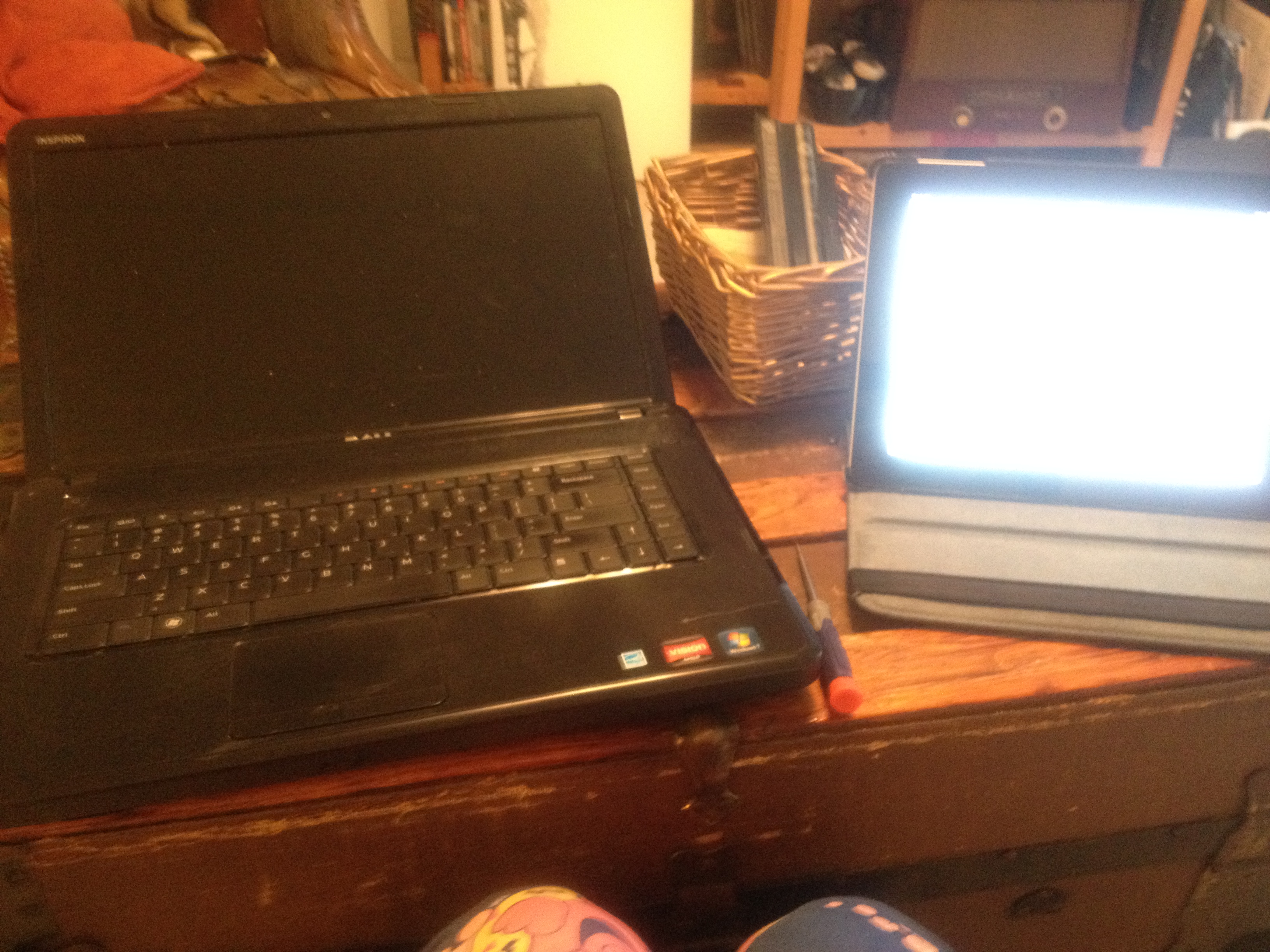 iPad right, Inspiron from hell left, signature Mr. Bubble pajama pants center.